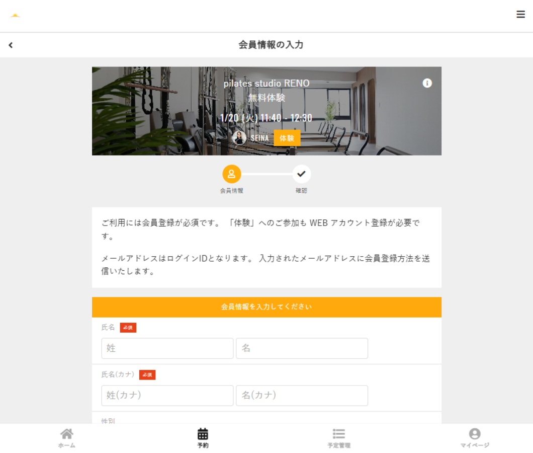「無料体験予約を申し込む」をクリックすると、会員登録画面へ移ります 。
