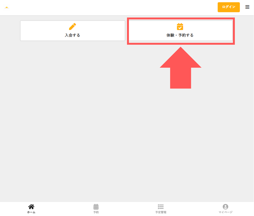 予約システムURLへアクセスし、「体験・予約する」を選択します 。